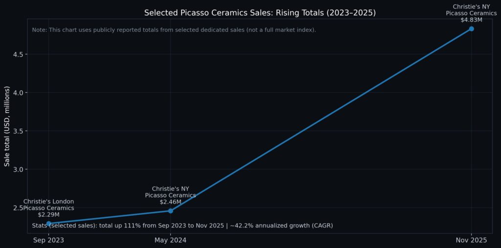 Toward the end of 2025, major international auction houses reported high sell-through rates and competitive bidding for Picasso ceramics, particularly for: